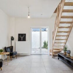 Op het gelijkvloers bevindt zich een geïnstalleerde open keuken met aansluitend de lichtrijke leefruimte dat zicht geeft op het mooie stadsterras.